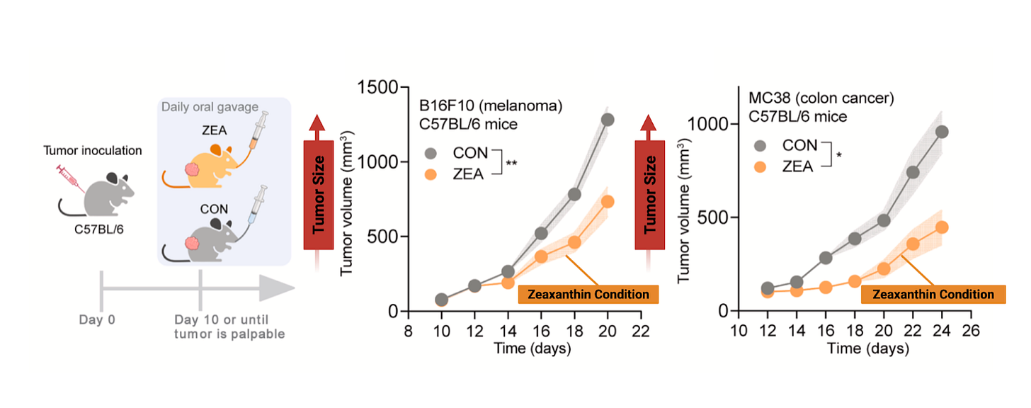 Researchers noticed that zeaxanthin levels rise in settings where cancer cells are being killed. That made it an obvious candidate to test more directly. So they turned to mouse models. Mice were given one of two different cancers and allowed to develop tumors. After the tumors had formed, the animals were split into groups: one group received zeaxanthin, the other did not.