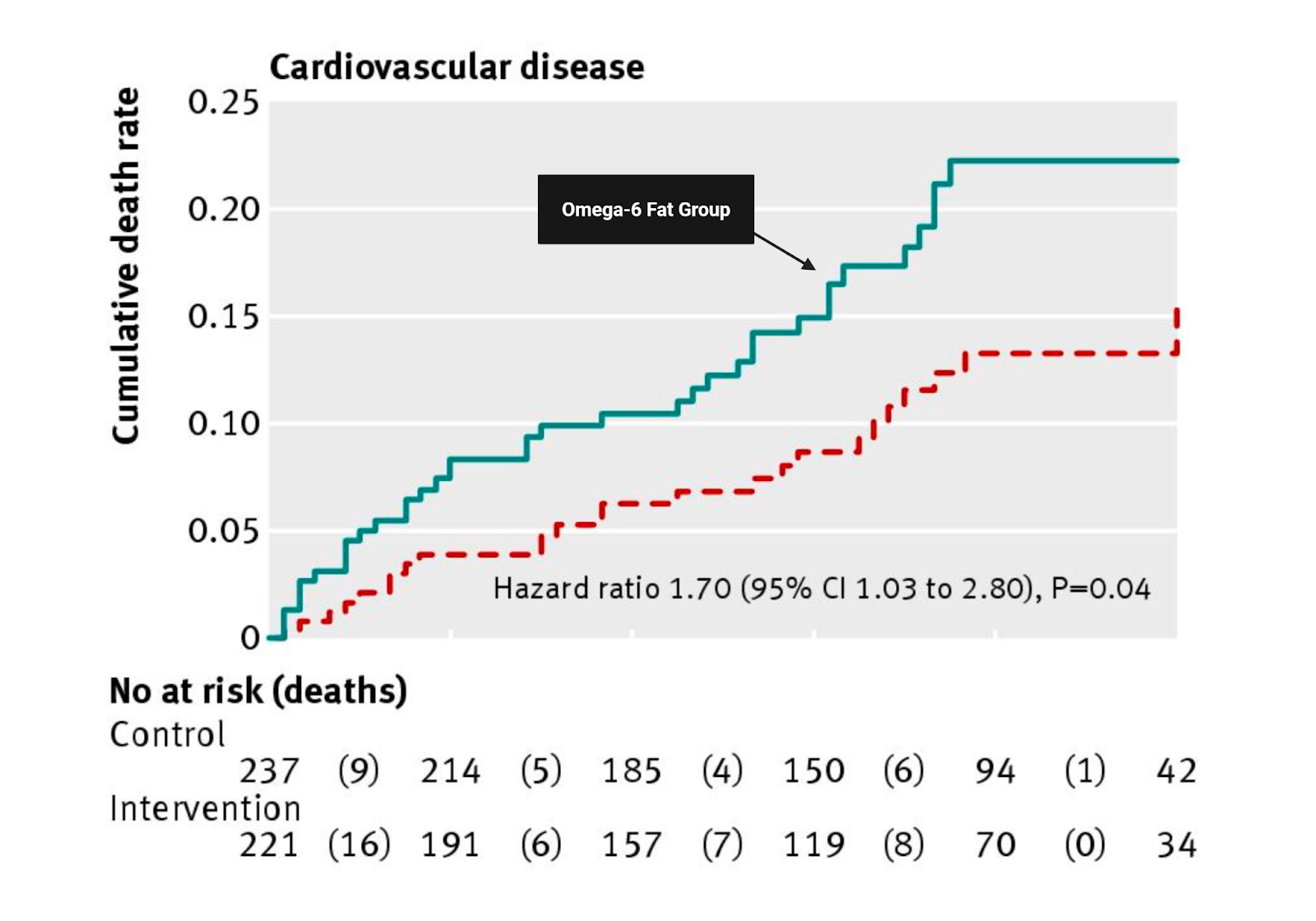 Looking at the survival data, the seed oil group (dotted line) showed a significantly lower survival rate over five years compared to the saturated fat group (solid line). In the follow-up analysis, researchers teased out cardiovascular-specific events, and the data showed a 70% increase in cardiovascular disease incidence in the seed oil group.