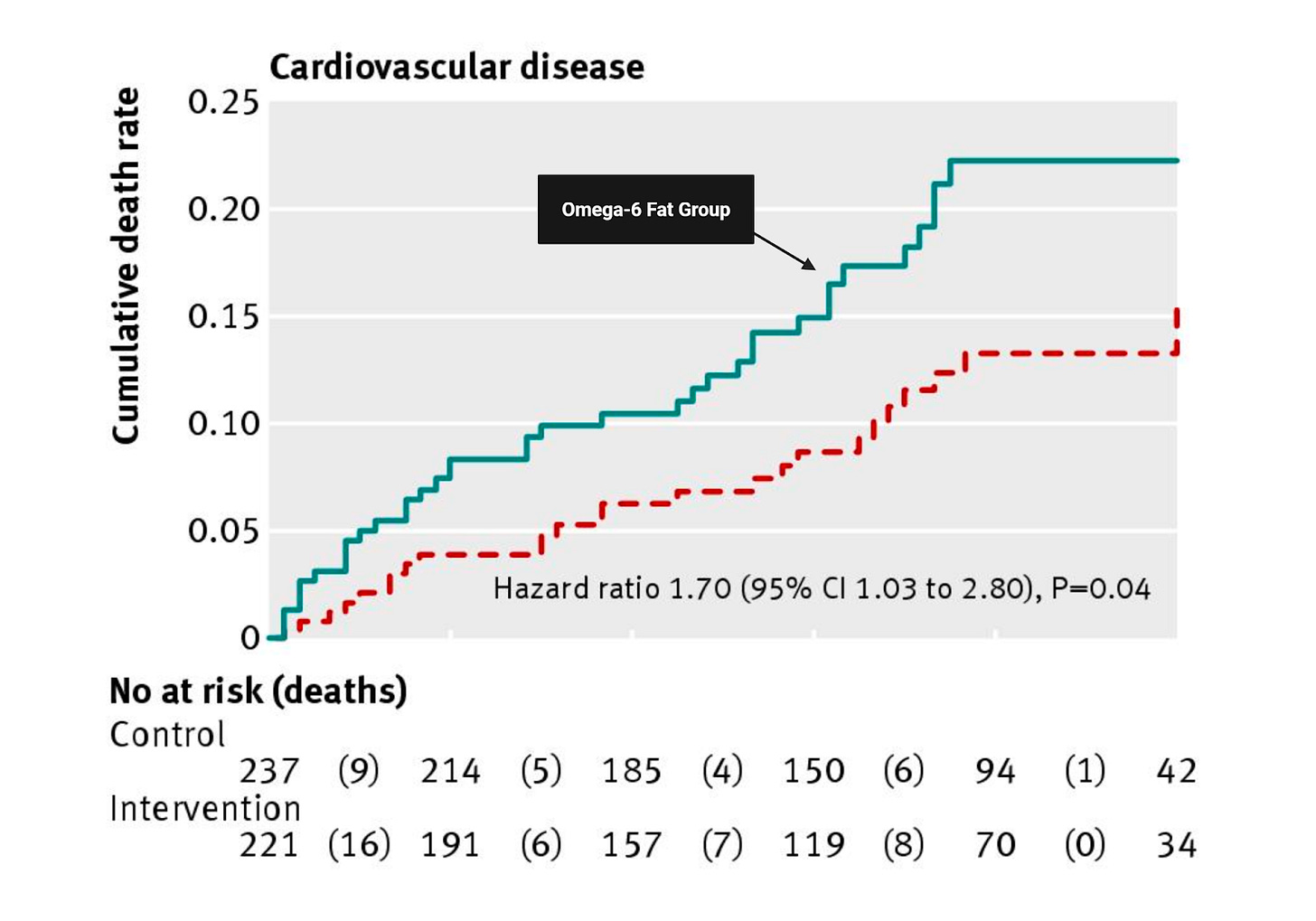 Furthermore, the intervention group was instructed to reduce saturated fat to less than 10% of their calories and increase polyunsaturated fat to at least 15%. This naturally led to higher margarine consumption—and likely, higher trans fat intake. Although the control group could also use margarine, they weren’t encouraged to, nor was their intake monitored or emphasized. So, the seed oil group likely consumed more trans fats overall, muddying the interpretation of omega-6 fats as the culprit.