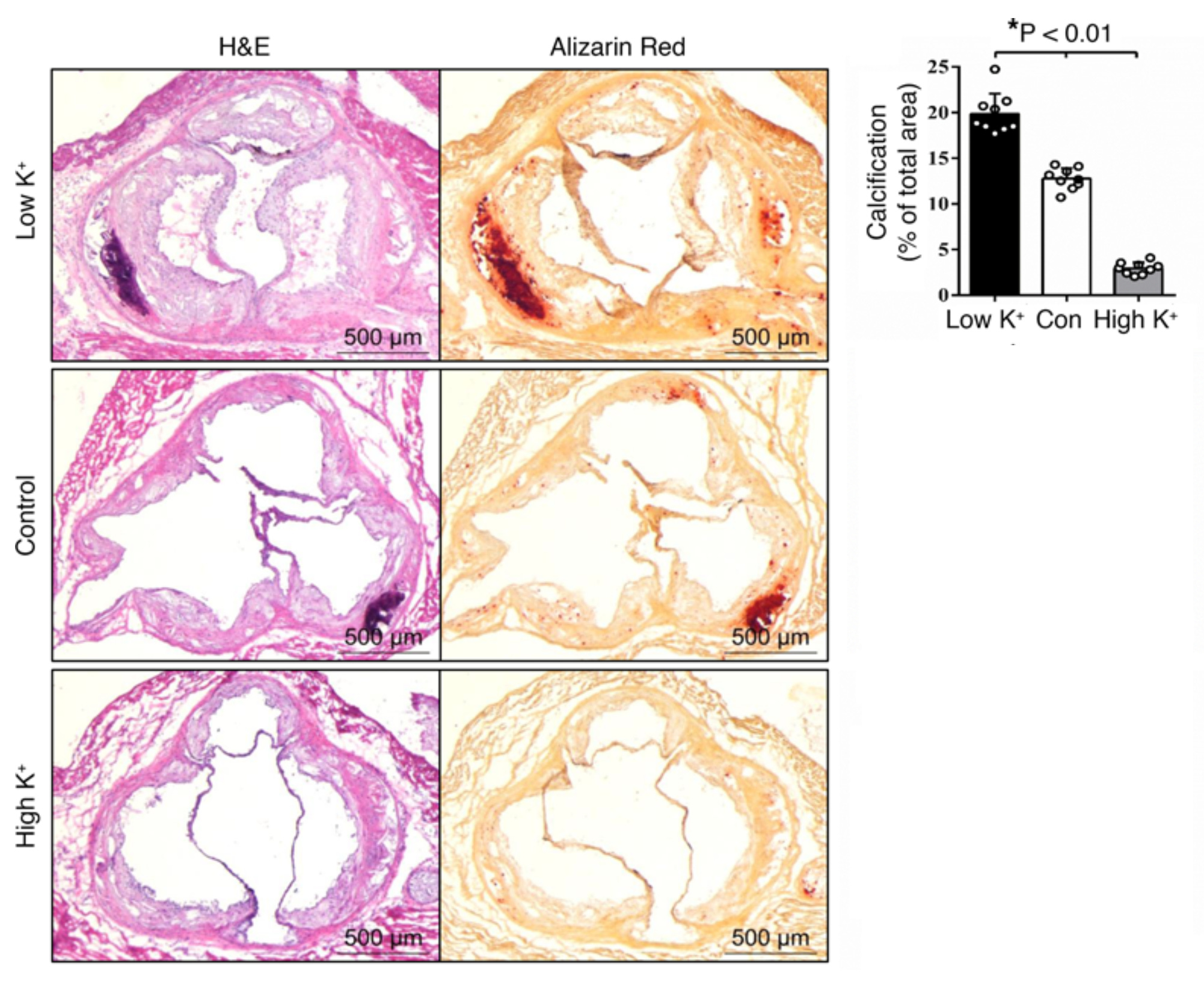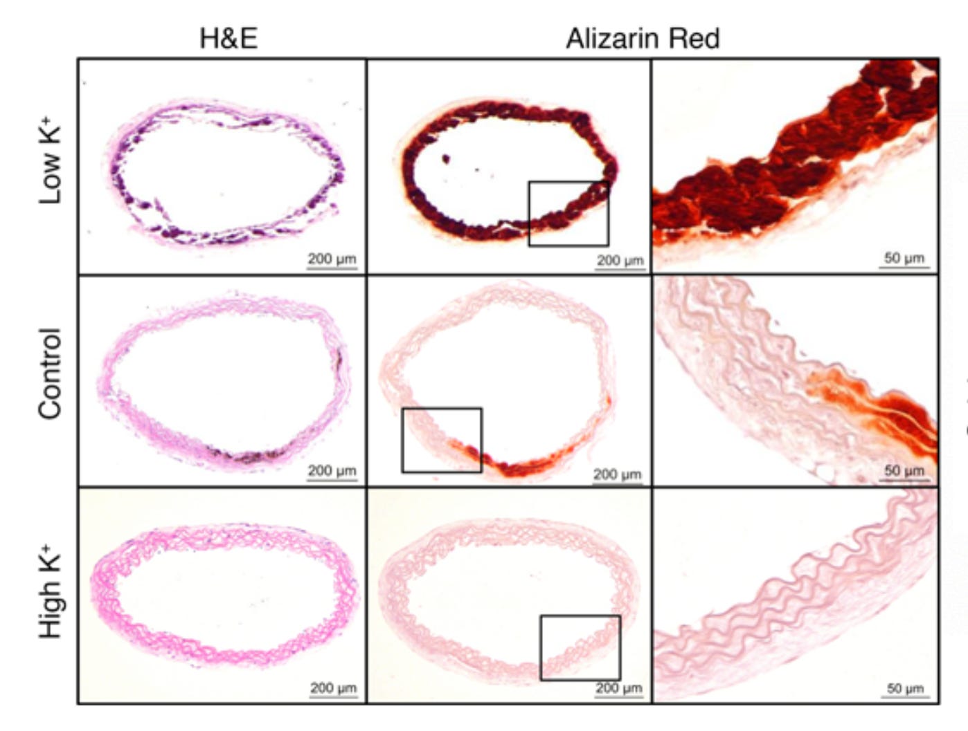 Microscopic images of the aorta were particularly telling. The blood channel (white) was surrounded by deep red staining indicating calcium. The lower the potassium, the more the aortic wall looked like bone.